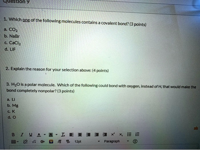 Solved Queslion 1 Which One Of The Following Molecules Contains Covalent Bond 3 Points Coz B Nabr Caclz D Lif 2 Explain The Reason For Your Selection Above 4 Points Hzo Is